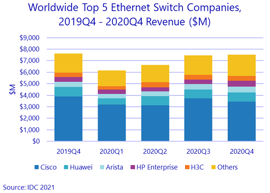 ICC訊(編譯:Nina)來自IDC的調(diào)研數(shù)據(jù)顯示,2020年第四季度,全球以太網(wǎng)交換機(jī)市場收入為75億美元,同比下滑1.4%;2020年全年,交換機(jī)市場收入為278億美元,相比2019年下滑3.5%。同時,2020年第四季度,全球企業(yè)和服務(wù)供應(yīng)商路由器市場達(dá)到43億美元,同比微幅增長0.6%;2020年全年,路由器市場收入達(dá)到149億美元,相比2019年下滑4.0%。