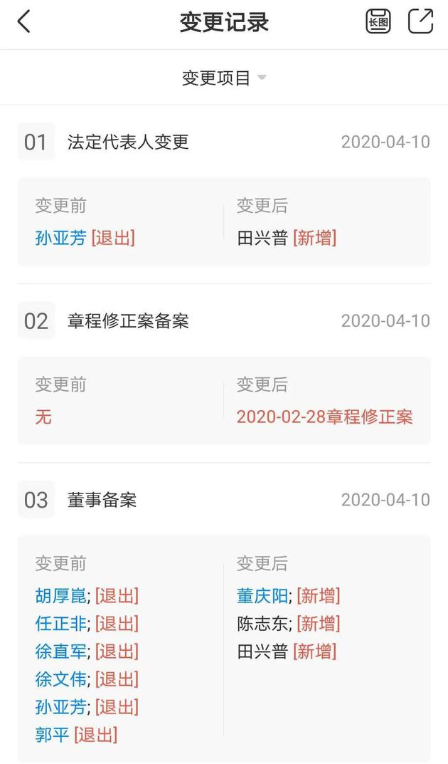 4月14日,天眼查顯示,華為全資子公司上海華為技術有限公司于本月10日發(fā)生工商變更,華為CEO任正非卸任上海華為技術公司董事一職,前華為總裁孫亞芳則卸任上海華為技術公司法定代表人,由田興普接任。胡厚崑、徐直軍、徐文偉、郭平等華為管理層也卸任上海華為技術公司董事職務,并新增董慶陽、陳志東為主要人員。