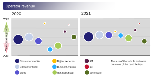 在經(jīng)濟不景氣的情況下,消費型電信市場相對具有彈性。在經(jīng)濟低迷時期,占電信收入大部分(68%)的消費者服務(wù)往往比商業(yè)電信服務(wù)更具彈性。在許多國家,居家隔離等限制以及對居家辦公和娛樂的重視意味著固定寬帶服務(wù)板塊的表現(xiàn)相對移動服務(wù)較好。該分析公司預(yù)測,2020年,消費者固定服務(wù)板塊收入降幅僅為0.4%,到2021年則將增長2.1%。