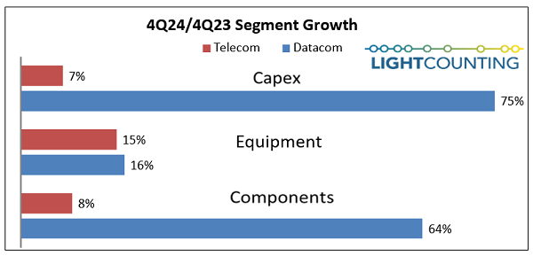 下圖展示了整個(gè)行業(yè)供應(yīng)鏈的增長(zhǎng)情況,分為電信和數(shù)據(jù)通信兩大垂直領(lǐng)域。這一次,所有數(shù)據(jù)均為正數(shù)。電信市場(chǎng)在經(jīng)歷了平淡無(wú)奇的一年后,憑借強(qiáng)勁的第四季度收官,主要得益于北美服務(wù)提供商的支出增加。部分反彈具有季節(jié)性,但多家設(shè)備和器件供應(yīng)商評(píng)論稱,電信需求持續(xù)復(fù)蘇的跡象明顯。