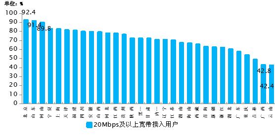 10月末,東、中、西部地區(qū)20Mbps及以上寬帶接入用戶分別比上年末凈增6691萬戶、3997萬戶、2325萬戶,東部地區(qū)的凈增用戶遠超中西部地區(qū),用戶滲透率中部地區(qū)領先,達到74.7%,比東部和西部分別高出1.8和9.2個百分點。各省間20Mbps及以上寬帶接入用戶占比差異呈放大態(tài)勢,北京、山東和河南分別居全國前三位,占比接近90%。