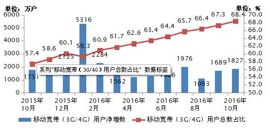 圖3 2015-2016年10月移動寬帶用戶當月凈增數(shù)和總數(shù)占比情況
