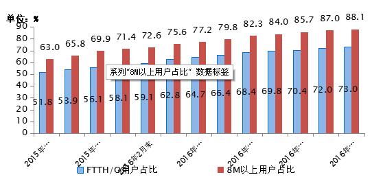 圖4 2015-2016年10月光纖接入FTTH/O和8Mbps及以上寬帶用戶占比情況