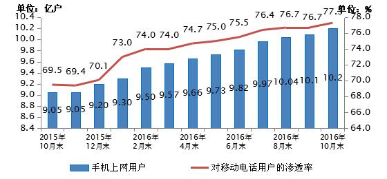 圖5 2015-2016年10月手機上網(wǎng)用戶和對移動電話用戶滲透率情況