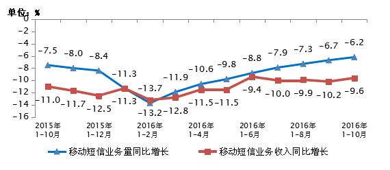 圖7 2015-2016年10月移動短信業(yè)務量和收入同比增長情況
