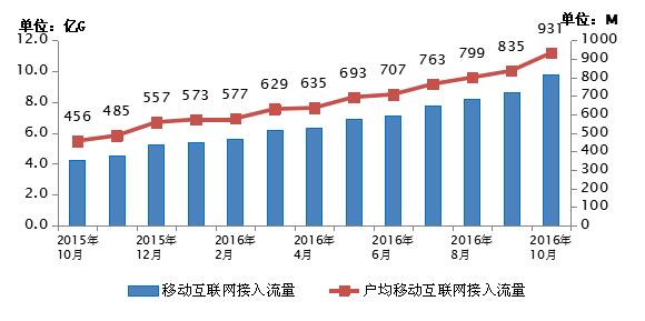 圖8 2015-2016年10月當月移動互聯(lián)網(wǎng)接入流量和戶均流量比較