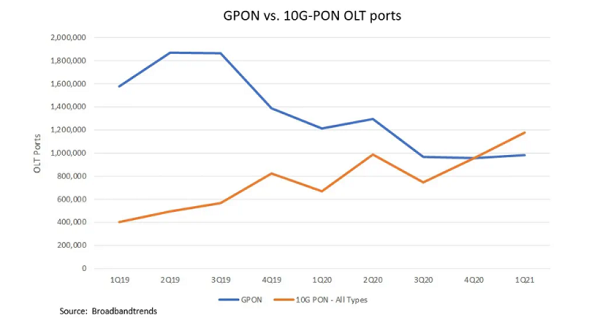 另一個已發(fā)生的轉(zhuǎn)變是從非對稱寬帶服務(wù)轉(zhuǎn)向?qū)ΨQ寬帶服務(wù)。后者通常保留用于商務(wù)類服務(wù),但目前越來越多的運營商正在推出對稱住宅服務(wù)。這導(dǎo)致寬帶設(shè)備需求類型的快速轉(zhuǎn)換,運營商越來越多地購買10G-PON設(shè)備而不是GPON設(shè)備。