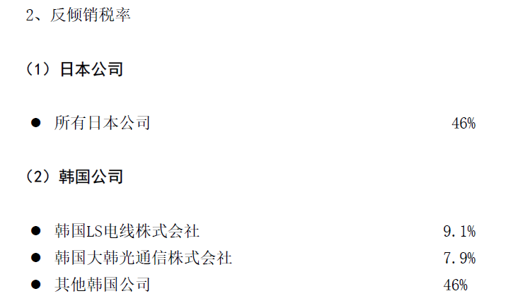 公告顯示,2005年1月1日,商務部發(fā)布2004年第96號公告,決定對原產(chǎn)于日本和韓國的進口非色散位移單模光纖征收反傾銷稅。經(jīng)期間復審及期終復審,該措施將于2021年12月31日到期,目前日本公司稅率為46%,韓國公司稅率為7.9%-46%。