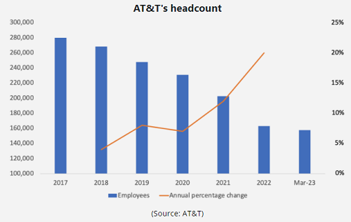 ICC訊(編譯:Nina)根據(jù)Light Reading匯編的數(shù)據(jù),甚至在ChatGPT和生成式人工智能入侵之前,AT&T就已經(jīng)裁員數(shù)千人——比北美或西歐的任何一家大型運(yùn)營(yíng)商都更熱情地裁減員工。包括時(shí)代華納在內(nèi),從2018年初到去年年底,AT&T的員工人數(shù)減少了11.71萬(wàn)人,約占2017年總數(shù)的42%。自今年1月份以來(lái),AT&T又有5100個(gè)工作崗位消失。