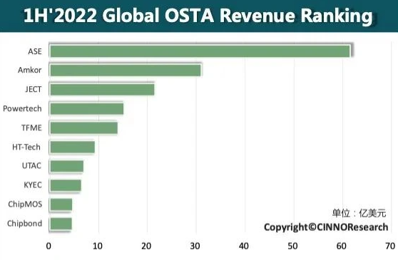 CINNO Research 公布的全球前十大半導體封測 (OSAT) 2022 年上半年經(jīng)營情況如下: