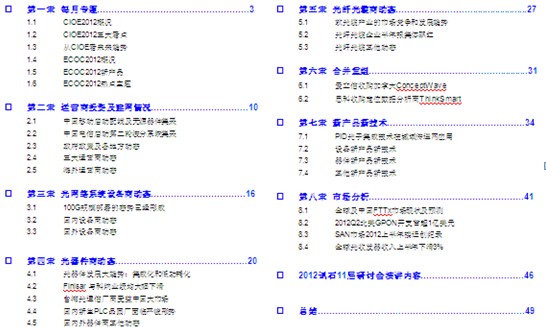 器件商部分:集成化和低耗能將是光器件未來發(fā)展趨勢;Finisar與科納業(yè)績環(huán)比均有下滑;得益中國的大市場寬帶建設(shè)局面,臺灣光通信廠商2012年上半年整體優(yōu)異,下半年前景看好;國內(nèi)新生PLC晶圓廠面臨嚴峻形勢及解決之道;國內(nèi)器件商上半年大都穩(wěn)步增長;國外器件商OneChip光子集成PON模塊已經(jīng)量產(chǎn),主攻中國市場,Mindspeed BOSA OnBoard出貨量過百萬,F(xiàn)CI公司有源光纜組件通過Infiniband兼容測試。