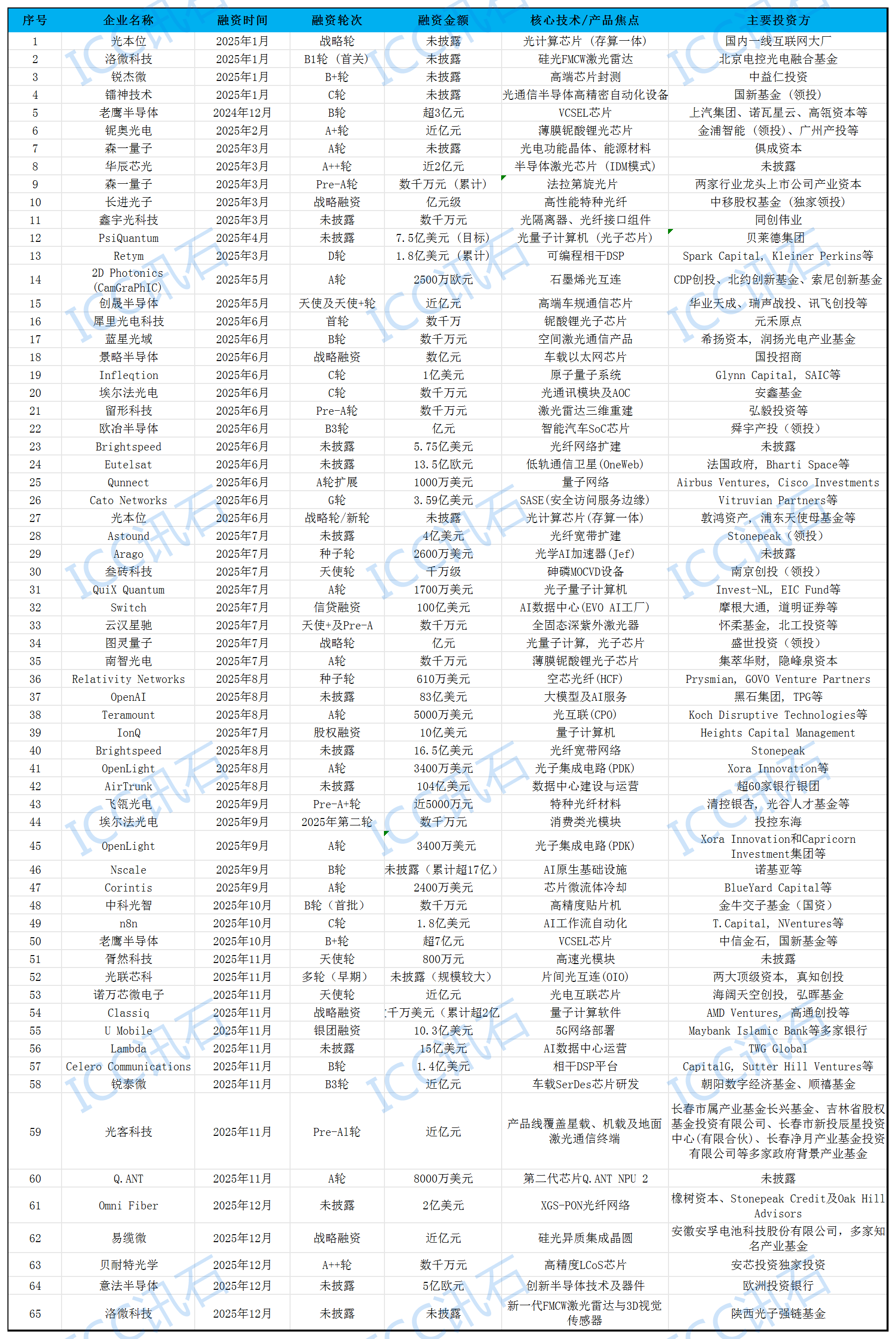 ICC訊 回顧2025年,隨著全球人工智能競賽進(jìn)入白熱化,作為算力網(wǎng)絡(luò)血脈的光通信技術(shù),迎來了前所未有的融資熱潮。資本不再停留于傳統(tǒng)的光纖網(wǎng)絡(luò)建設(shè),而是深度滲透至芯片、材料、設(shè)備等核心環(huán)節(jié),一場圍繞“數(shù)據(jù)如何更快、更高效、更低成本地傳輸”的技術(shù)革命,正由巨額資本強(qiáng)力驅(qū)動。