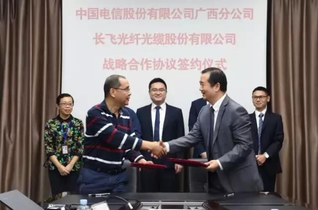 ICCSZ訊 2017年10月26日,長飛光纖光纜股份有限公司(以下簡稱“長飛公司”,股票代碼:6869.HK)與中國電信集團(tuán)股份有限公司廣西分公司(以下簡稱“中國電信廣西分公司”)成功簽署了戰(zhàn)略合作協(xié)議。中國電信廣西分公司副總經(jīng)理葉松華,采購部總經(jīng)理李強(qiáng),采購部副總經(jīng)理黃敏,采購部余忠澤、楊磊,長飛公司國內(nèi)公網(wǎng)總部經(jīng)理周宏慷,華南大區(qū)銷售總監(jiān)王翔,華南大區(qū)董小雷、盧來利出席了簽約儀式。