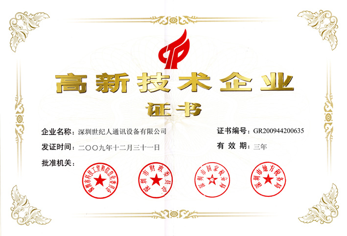 世紀人通訊設(shè)備有限公司作為深圳市2009年第三批企業(yè),被認定為