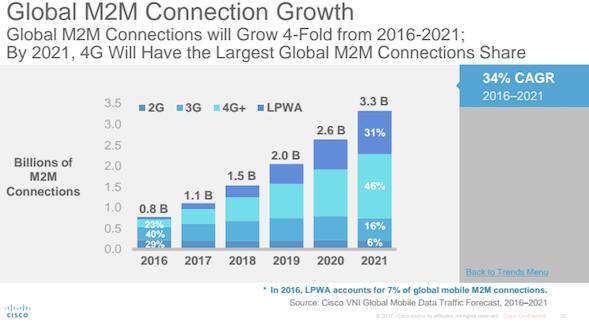 有趣的是,思科研究表明到2021年,46%的M2M連接將超過(guò)4G蜂窩網(wǎng)絡(luò),而在低功率廣域(LoRa)M3M網(wǎng)絡(luò)中為31%。2016年,LoRa承載約7%的M2M流量,而4G承載約23%的M2M流量。