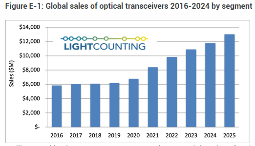 如圖所示,LC預(yù)計,為滿足許多應(yīng)用對更大帶寬的需求,2020年光收發(fā)器市場將有所增長,到2021年將增長24%。在中國5G升級按計劃的推動下,無線前傳和回傳光器件銷售額將分別增長18%和92%。FTTx和AOC板塊在中國市場的部署推動下,今年也將實現(xiàn)兩位數(shù)的增長。以太網(wǎng)和DWDM市場將在2021年恢復(fù)兩位數(shù)的增長,以趕上今年的延遲。