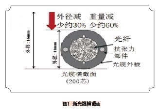 NTT研究所開(kāi)發(fā)出的最高密度用戶(hù)配線(xiàn)光纖光纜,適合于架空與城市中地下管道中布放。光纜中的光纖數(shù)從24芯到200芯,和歷來(lái)的骨架式光纜相比,無(wú)論是重量還是直徑都大幅降低。如圖1。