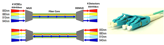 SWDM (Short Wavelength Division Multiplexing)是指短波段波分復(fù)用技術(shù),在一芯多模光纖上傳輸4個(gè)波段的光信號(hào)。多模光纖中四個(gè)波段的窗口分別是850nm,880nm,910nm以及940nm。波分復(fù)用的原理與單模上的CWDM類似,而SWDM是首次將波分復(fù)用技術(shù)應(yīng)用多模光纖短波段上,可以參考下圖4傳輸原理的模型。