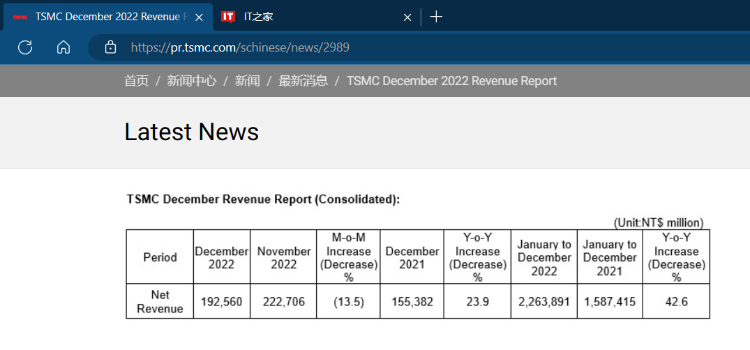 ICC訊 臺積電今日公布了 2022 年 12 月凈營收: