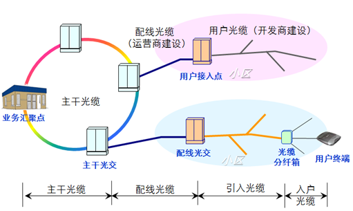 一個局通過主干光纜連接多個(10-20)主干光交,每個主干光交通過配線光纜連接多個配線光交,每個配線光交通過引入光纜連接多個(數(shù)十個)分纖箱,每個分纖箱則通過皮線光纜連接多個(十余個)用戶。這樣就使一個局只需要數(shù)條出局光纜就可以收容數(shù)萬用戶。