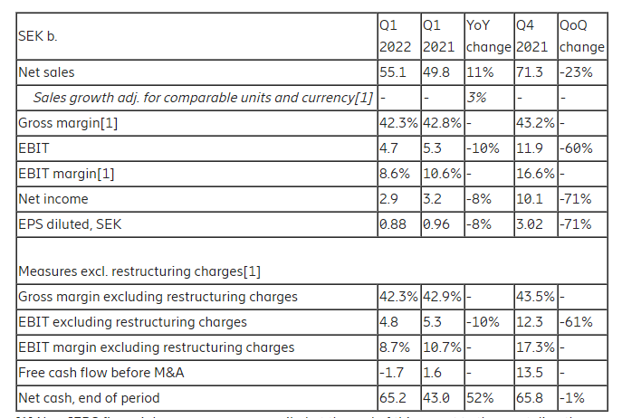 2022年第一季度愛立信銷售收入為551億瑞典克朗,與去年同期為498億瑞典克朗,同比增長11%。上個季度為713億瑞典克朗,環(huán)比下滑23%。毛利率為42.3%,去年同期為42.8%。第一季度凈收入29億瑞典克朗,去年同期凈收入32億瑞典克朗,同比下滑8%;上個季度凈收入101億瑞典克朗,環(huán)比下滑71%。
