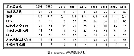 從光纜使用用途分析:骨干網(wǎng)用纜在2012年后有明顯下降趨勢(shì),且降幅較大。FTTx用纜在今后5年保持穩(wěn)步增長(zhǎng)勢(shì)頭。本地接入網(wǎng)的需求則在2013年后有較快的增長(zhǎng)。其他光纜的用量保持勻速上升的態(tài)勢(shì)(見表2)。
