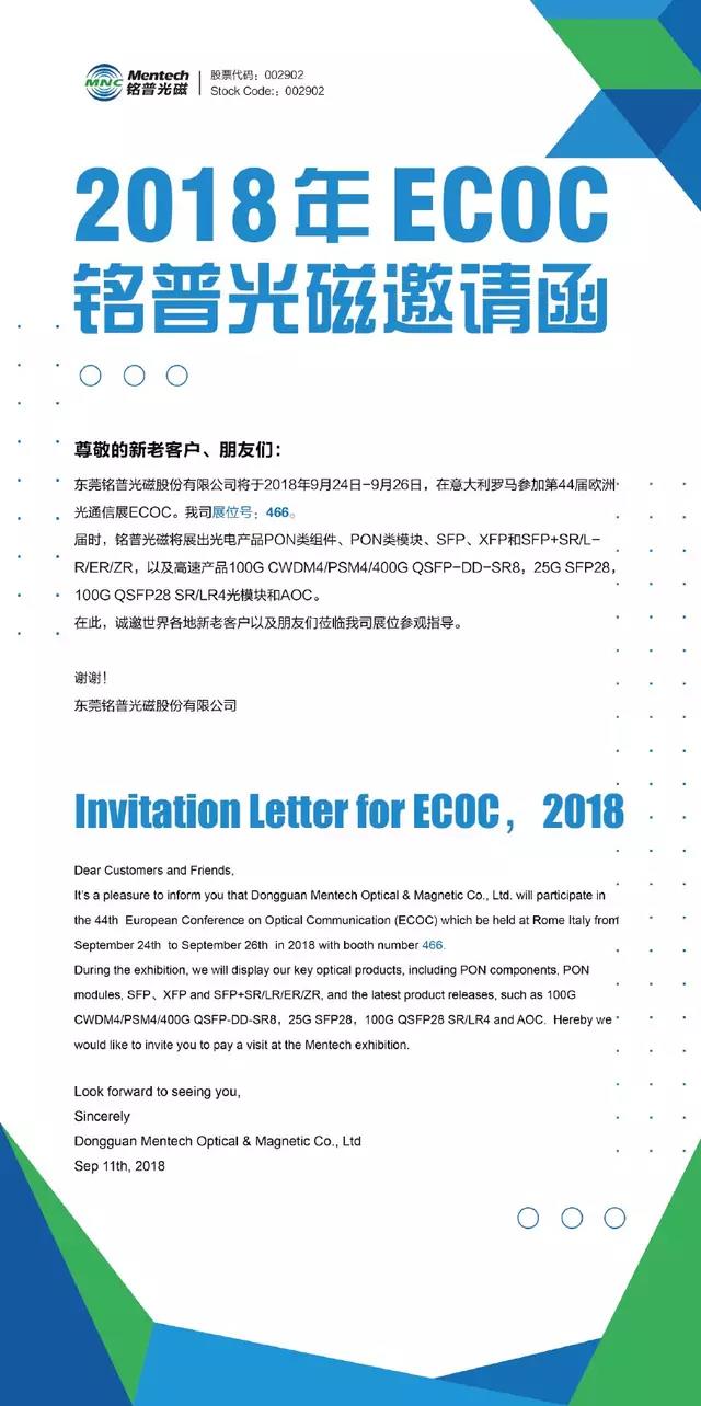 東莞銘普光磁股份有限公司將于2018年9月24日-9月26日,在意大利羅馬參加第44屆歐洲光通信展ECOC。我司展位號(hào):466。
