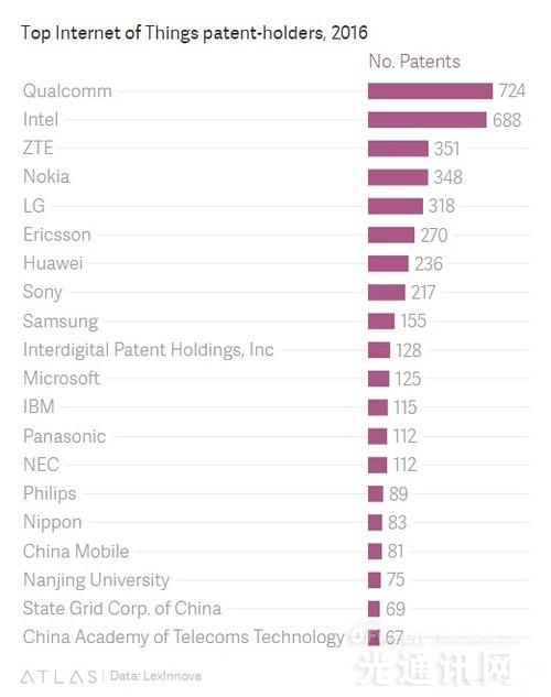 此外值得一提的是在2016年物聯(lián)網(wǎng)專利數(shù)增長迅猛的幾家企業(yè),第一是高通,增長了157個專利,緊隨其后的是LG,增長了63個。與他們相比,似乎網(wǎng)絡(luò)設(shè)備制造商在2016年的專利增長速度則有些放緩。
