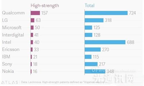 可以看到,芯片巨頭高通和英特爾排名前兩位,專利數(shù)量是第三名的2倍;而中興、愛立信和華為等網(wǎng)絡(luò)設(shè)備制造商則形成了第二陣營,專利數(shù)基本處于同一水平。