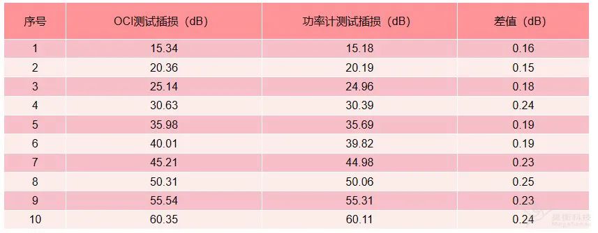 改變可調(diào)光衰減器插損,按照上述方法分別用OCI和功率計測試可調(diào)光衰減器插損值,下表為10次測量可調(diào)光衰減器插損值對比表。