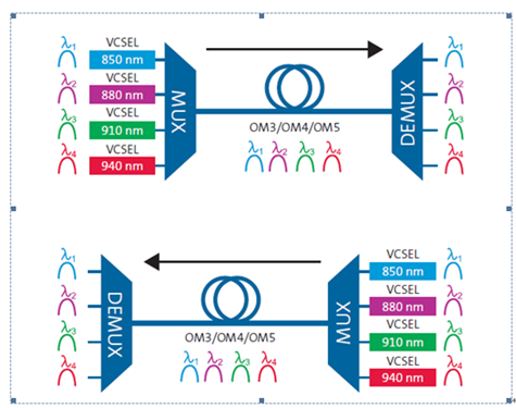 在這場(chǎng)競(jìng)爭中,還有另一種收發(fā)器傳輸技術(shù),短波分復(fù)用(SWDM)收發(fā)器。與用于40G鏈路的BiDi類似,SWDM收發(fā)器僅需要一個(gè)兩芯LC雙工連接,不同的是SWDM每根光纖工作在850nm到940nm之間的4個(gè)不同的波長上,其中一根光纖專用于傳輸信號(hào),另一根光纖專用于接收信號(hào)。