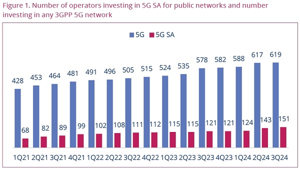 根據(jù)GSA在2024年11月下旬發(fā)布的報告,全球63個國家和地區(qū)(相比9月發(fā)布的報告新增2個國家和地區(qū))的151家運營商(相比9月發(fā)布的報告新增8家運營商)已經(jīng)以試驗、計劃或?qū)嶋H部署的形式投資公共5G SA網(wǎng)絡(luò),占正在投資5G許可證、試驗或任何類型網(wǎng)絡(luò)部署的運營商中的24.3%。