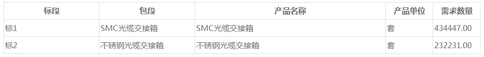 ICCSZ訊 (編輯:Nicole)中國移動公布2018年至2019年光纜交接箱產(chǎn)品集中采購中標(biāo)候選人名單,2個標(biāo)段各八家企業(yè)中標(biāo)。據(jù)悉,本次集采標(biāo)段一為SMC光纜交接箱43.45萬套,標(biāo)段二為雙層不銹鋼光纜交接箱23.22萬套。