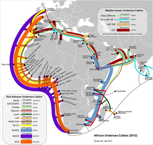 報(bào)告稱,海底光纜市場的關(guān)鍵增長驅(qū)動(dòng)力是帶寬增長。目前非洲的互聯(lián)網(wǎng)滲透率比世界其他國家低。2015年,非洲的滲透率為29.52%,而其他地區(qū)近50%。這清晰表明非洲具有電信擴(kuò)張的重要潛力。伴隨非洲企業(yè)的增加數(shù)量,互聯(lián)網(wǎng)活動(dòng)的需求必然增長。為了占據(jù)市場潛力,電信運(yùn)營商和網(wǎng)絡(luò)服務(wù)供應(yīng)商需要提供滿足客戶對可靠電網(wǎng)及增加帶寬等需求的產(chǎn)品。2001年,非洲鋪設(shè)了第一條海纜—SAT-3/WASC 海底電纜。