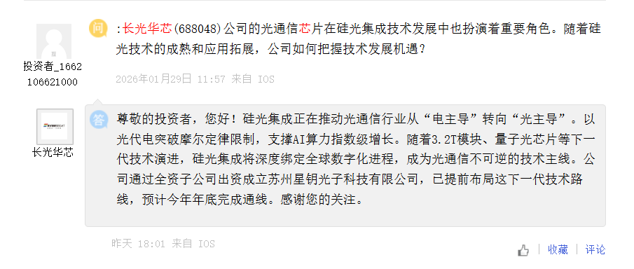 ICC訊 近日,長(zhǎng)光華芯在互動(dòng)平臺(tái)公開表示,硅光集成技術(shù)正推動(dòng)光通信行業(yè)迎來歷史性變革,逐步實(shí)現(xiàn)從“電主導(dǎo)”向“光主導(dǎo)”的跨越。隨著3.2T模塊、量子光芯片等下一代技術(shù)的加速演進(jìn),硅光集成將深度綁定全球數(shù)字化進(jìn)程,成為光通信領(lǐng)域不可逆的技術(shù)主線,而公司已通過全資子公司星鑰光子提前布局該賽道,相關(guān)項(xiàng)目預(yù)計(jì)于2026年底完成通線。