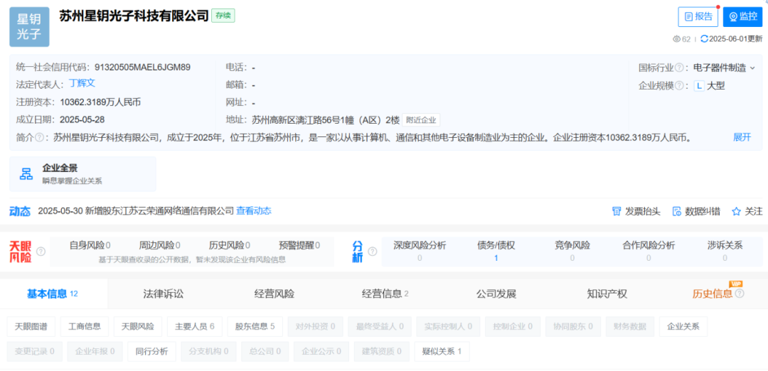 作為光芯片領(lǐng)域的核心企業(yè),長(zhǎng)光華芯敏銳捕捉到硅光集成的產(chǎn)業(yè)機(jī)遇,早已啟動(dòng)技術(shù)布局。據(jù)悉,公司通過全資子公司出資設(shè)立蘇州星鑰光子科技有限公司,專門聚焦硅光集成下一代技術(shù)路線的研發(fā)與產(chǎn)業(yè)化。天眼查信息顯示,蘇州星鑰光子成立于2025年5月,注冊(cè)資本達(dá)10362.3189萬人民幣,主營(yíng)業(yè)務(wù)涵蓋計(jì)算機(jī)、通信和其他電子設(shè)備制造業(yè),目前項(xiàng)目尚處于建設(shè)期,預(yù)計(jì)2026年底完成通線試運(yùn)行。