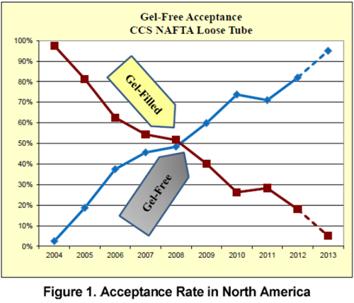 2000年以后, 隨著SAP技術(shù)和光纜工藝技術(shù)的進(jìn)步,使得光纜套管中的填充油膏可以完全去除,使用全干式阻水材料替代,如聚酯紗線和SAP纖維復(fù)合紗線,或聚酯紗線附著SAP顆粒,在松套管擠出過程中將這些阻水材料隨著光纖一起放入套管。這些進(jìn)步大大減少了施工現(xiàn)場端接的勞動量,同時提供了更干凈的光纖表面,光纖的熔接質(zhì)量更好。全干式光纜設(shè)計的演進(jìn),如今在北美市場,幾乎所有的運(yùn)營商都選擇全干式光纜。此外,北美一些大的光纜供應(yīng)商都以全干式光纜產(chǎn)品為主要產(chǎn)品。圖1是北美市場全干式光纜和油膏填充式光纜接受比例。而且,在日本市場,99%的光纜都是采用全干式技術(shù)。