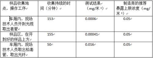 結(jié)果表明,在實(shí)驗(yàn)操作車廂內(nèi),可呼吸的塵埃濃度遠(yuǎn)遠(yuǎn)低于制造廠商推薦的濃度限值,因此,這種光纜的接續(xù)操作過程不存在危害健康。