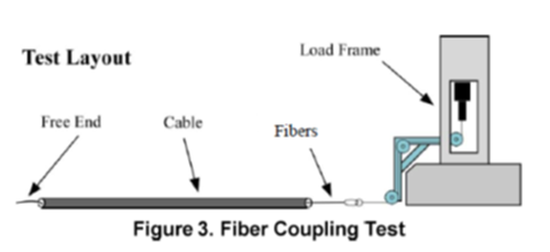 光纖在光纜中靜態(tài)耦合力值測試方法:拉力測試機(jī),從不同長度的光纜樣品中將光纖拉出,測量光纖的拉出力值,同時與油膏填充光纜進(jìn)行對比。確保測試光纜樣品平直和水平放置,如圖3所示,從一端開剝出約1米的光纖,將光纖固定在負(fù)載夾具上,將光纖以100±25mm/分鐘速率水平拉出,當(dāng)負(fù)載力值不再增加時停止實(shí)驗(yàn)。