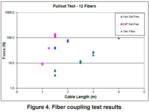 與采用阻水紗線和油膏填充式的光纜結(jié)構(gòu)相比,松套管采用SAP樹脂的光纜中光纖的耦合力值最好。所有測試樣品長度小于5米,太長的光纜樣品會導(dǎo)致光纖拉斷。隨著套管內(nèi)徑減小,光纖在光纜中的耦合力值增大。