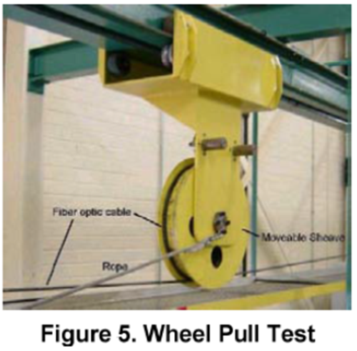 光纜的兩端標(biāo)準(zhǔn)夾具固定住。將光纜拉倒最大允許拉力下,測試光纖損耗作為基準(zhǔn)線。然后,來回移動輪子10次,停止后再測試光纖衰減。