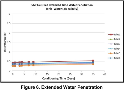 依據(jù)圖6的測試結(jié)果,光纜樣品經(jīng)過35天滲水測試后,水滲入的長度小于1米, SAP全干式光纜在自來水和鹽水環(huán)境下,滲水性能、吸水速率、長期阻水效果遠(yuǎn)遠(yuǎn)優(yōu)于行業(yè)標(biāo)準(zhǔn),證明是長期可靠的。