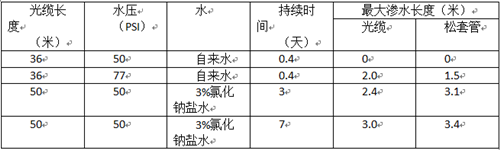 將SAP全干式光纜樣品接到壓強(qiáng)為50PSI和77PSI的水柱環(huán)境下,本實(shí)驗(yàn)使用兩種水柱,自來水和3%的氯化鈉溶液。測試后,將光纜開剝,觀察纜芯滲水長度和松套管中滲水長度,記錄結(jié)果列于表3,結(jié)果表明SAP即使在高壓水環(huán)境下依然能達(dá)到有效的阻水性能。