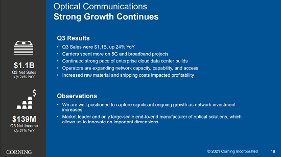 康寧表示,現(xiàn)階段,用戶對網(wǎng)絡(luò)的需求空前高漲,為運營商進(jìn)行大量投資以及擴(kuò)大網(wǎng)絡(luò)容量、能力和接入奠定了基礎(chǔ)。本季度,公司宣布與AT&T合作。康寧的產(chǎn)能擴(kuò)張將使AT&T能夠擴(kuò)大對光纖基礎(chǔ)設(shè)施的投資,擴(kuò)大美國寬帶網(wǎng)絡(luò),并加速5G部署。康寧繼續(xù)跑贏市場。