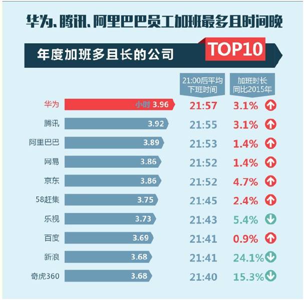 華為的加班文化,在圈內(nèi)外是早已有名。根據(jù)近日高德地圖聯(lián)合交通運(yùn)輸部科學(xué)研究院發(fā)布的《2016 年度中國主要城市交通分析報告》,華為是平均下班時間最晚的公司,直到 21:57分,每天加班時間接近4小時,超過BAT等互聯(lián)網(wǎng)公司。