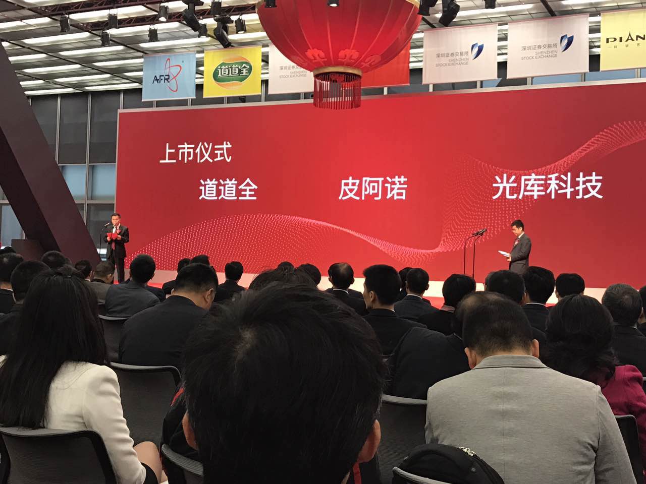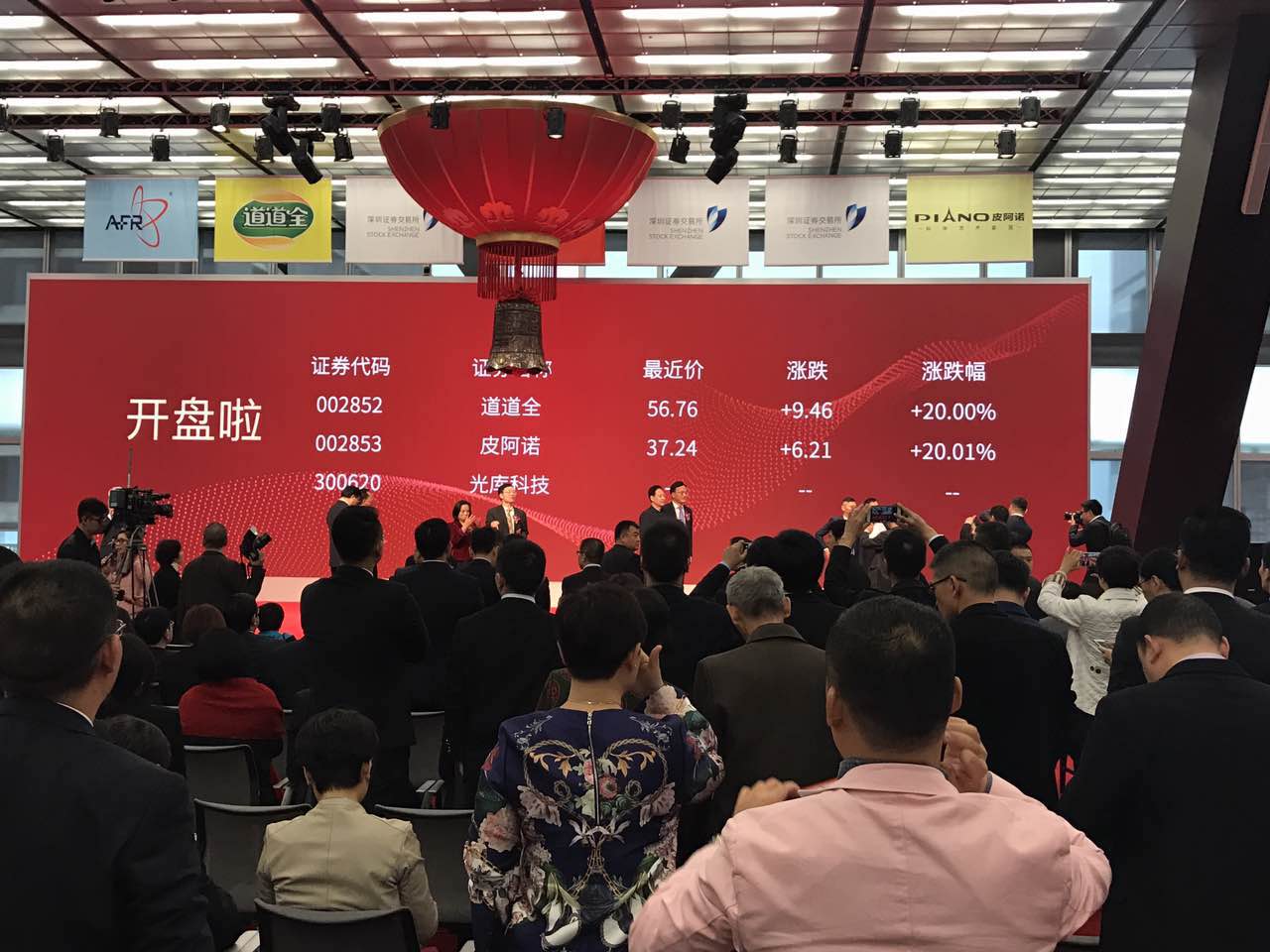 開盤后,一經(jīng)上市三家上市公司中兩家漲停。主持人幽默的說由于光庫股票持有者沒人愿意賣,光庫科技尚未見交易,臺(tái)下掌聲齊鳴!