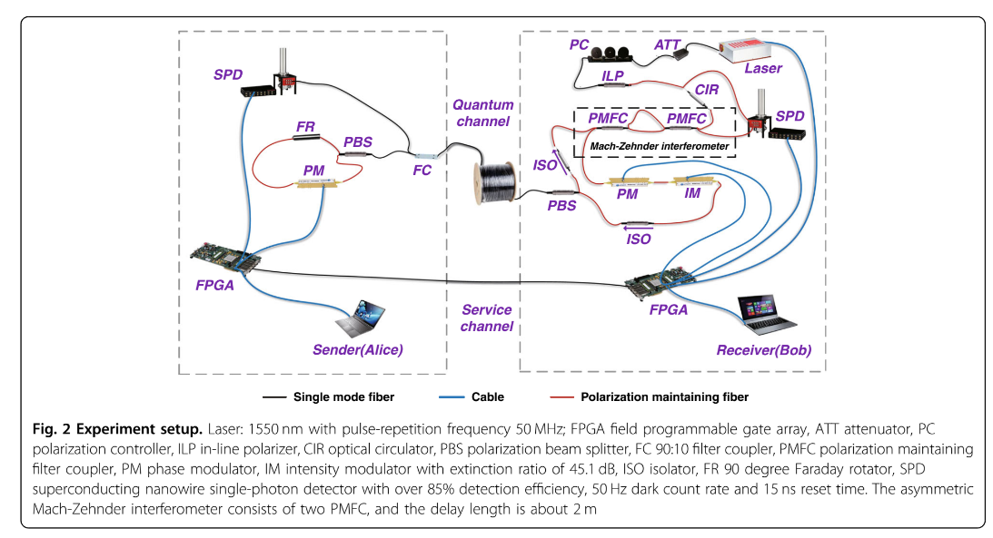 新系統(tǒng)在50MHz激光脈沖頻率下將最大可容忍損耗從5.1dB提升到18.4dB,在商用低損耗單模光纖中的最遠通信距離達到了100公里,突破了之前18公里的最長距離。新系統(tǒng)的通信速率也得到了提高,在30公里的光纖距離,通信速率達到22.4 kbps。新系統(tǒng)在激光脈沖頻率上還有大的提升空間,相應(yīng)的通信距離、速率有望進一步提升,滿足部分場景的應(yīng)用需求。
