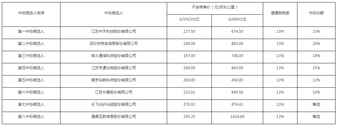 四川移動(dòng)公示2021-2022年金屬蝶型光纜集采項(xiàng)目中標(biāo)候選人名單,共有中天科技、特發(fā)信息、烽火通信、亨通光電、華脈科技、永鼎股份、長(zhǎng)飛光纖光纜及通鼎互聯(lián)等8家廠商上榜。