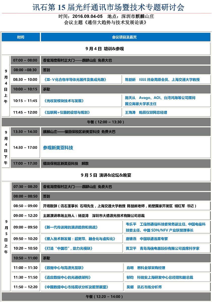 ICCSZ訊 鵬城美如畫,山莊似往年。2016年9月4日,主題為《通信大趨勢與技術發(fā)展論談》的訊石第十五屆光纖通訊市場暨技術專題研討會(以下稱“訊石研討會”)將在深圳麒麟山莊拉開序幕。本次研討會歷時兩天,9月4日上午研習會,由IEEE終身高級會員、上海交通大學教授陳益新老師與Avago、AOI、臺灣鴻海等公司顧問施天從博士領銜主講,與您分享重量級干貨知識;9月4日下午將由訊石帶隊參觀深圳本地光通訊領頭羊、美國500強企業(yè)新美亞科技,工廠現(xiàn)場感受大家風范。
