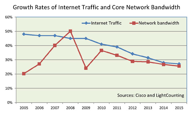 交通流量增長了35-40%,而密集波分復(fù)用(DWDM)技術(shù)的投資僅增長20-25%。到了07-08年,這一差距開始縮小。